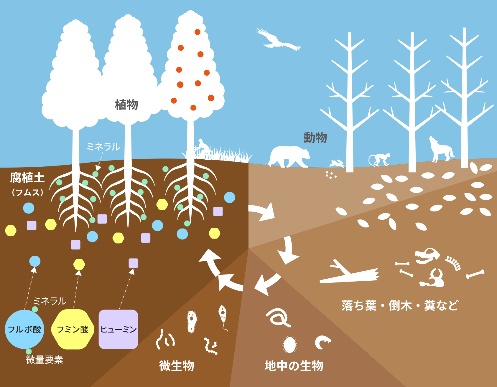 腐植物質とは、枯れた樹木や落ち葉、動物の排泄物・死骸などの有機物を、微生物や菌が分解し、長い年月をかけてできあがるものです。