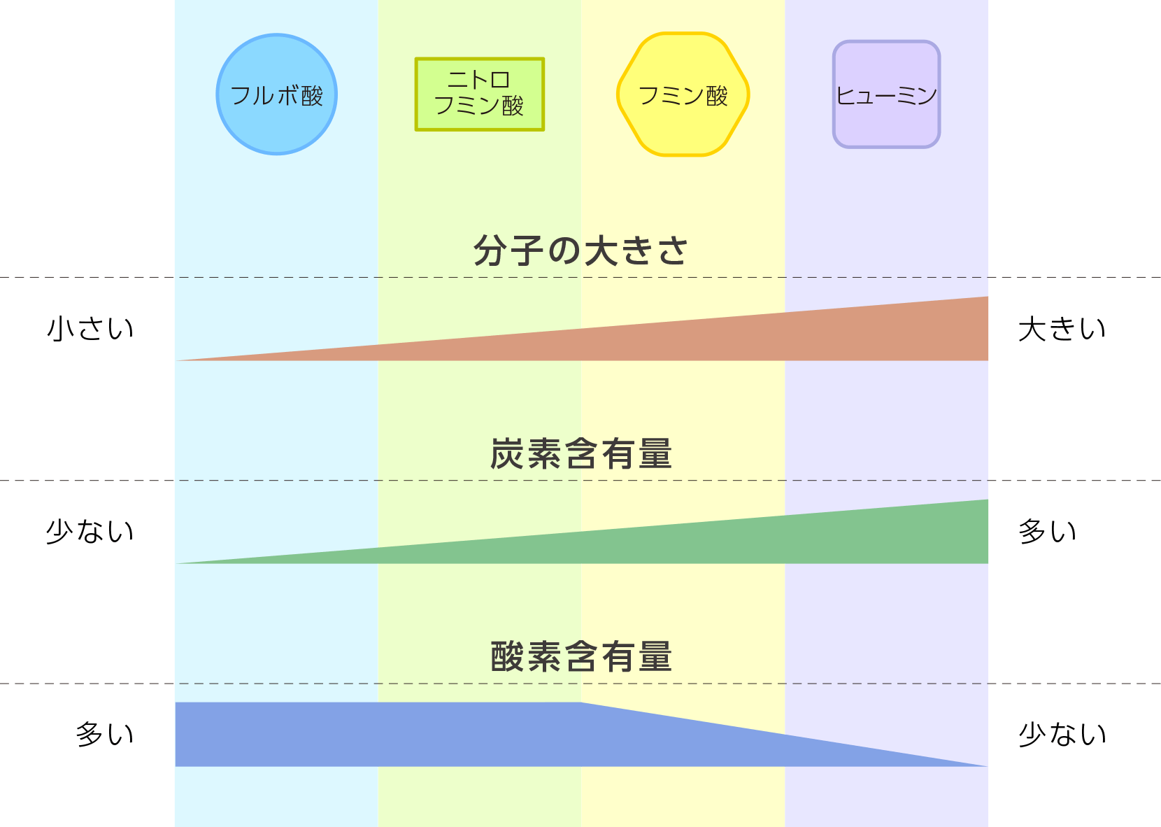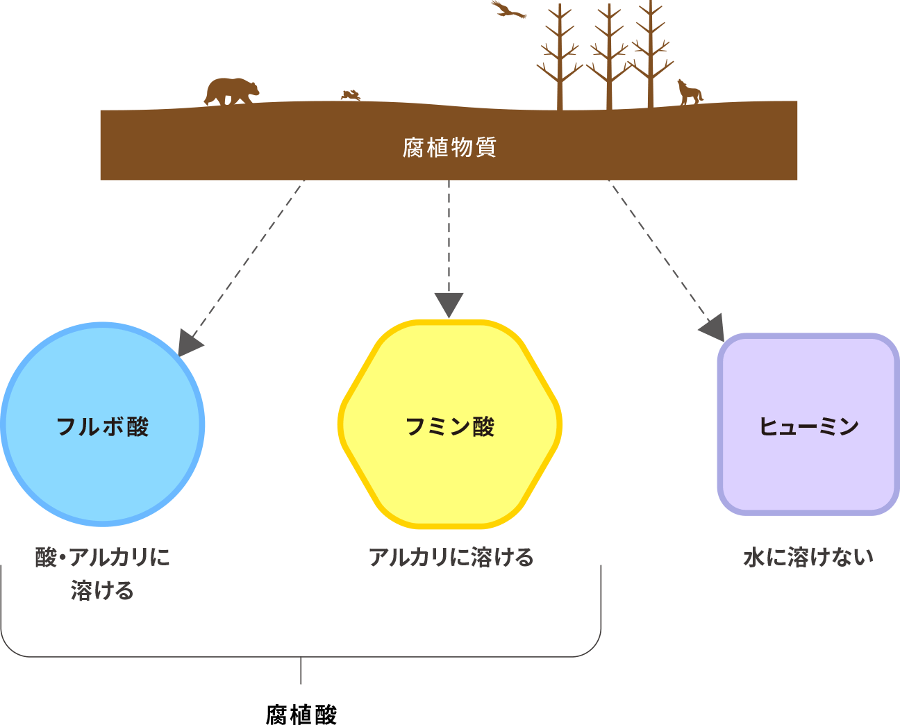 腐植物質には、「フルボ酸」「フミン酸」「ヒューミン」があり、酸やアルカリによる溶解度が異なります。(アルカリ・酸、両方に溶ける部分を「フルボ酸」、アルカリに溶けて酸では溶けない部分を「フミン酸」、ほとんど溶けない部分を「ヒューミン」と呼びます)そのうち、「フルボ酸」と「フミン酸」が、腐植酸です。