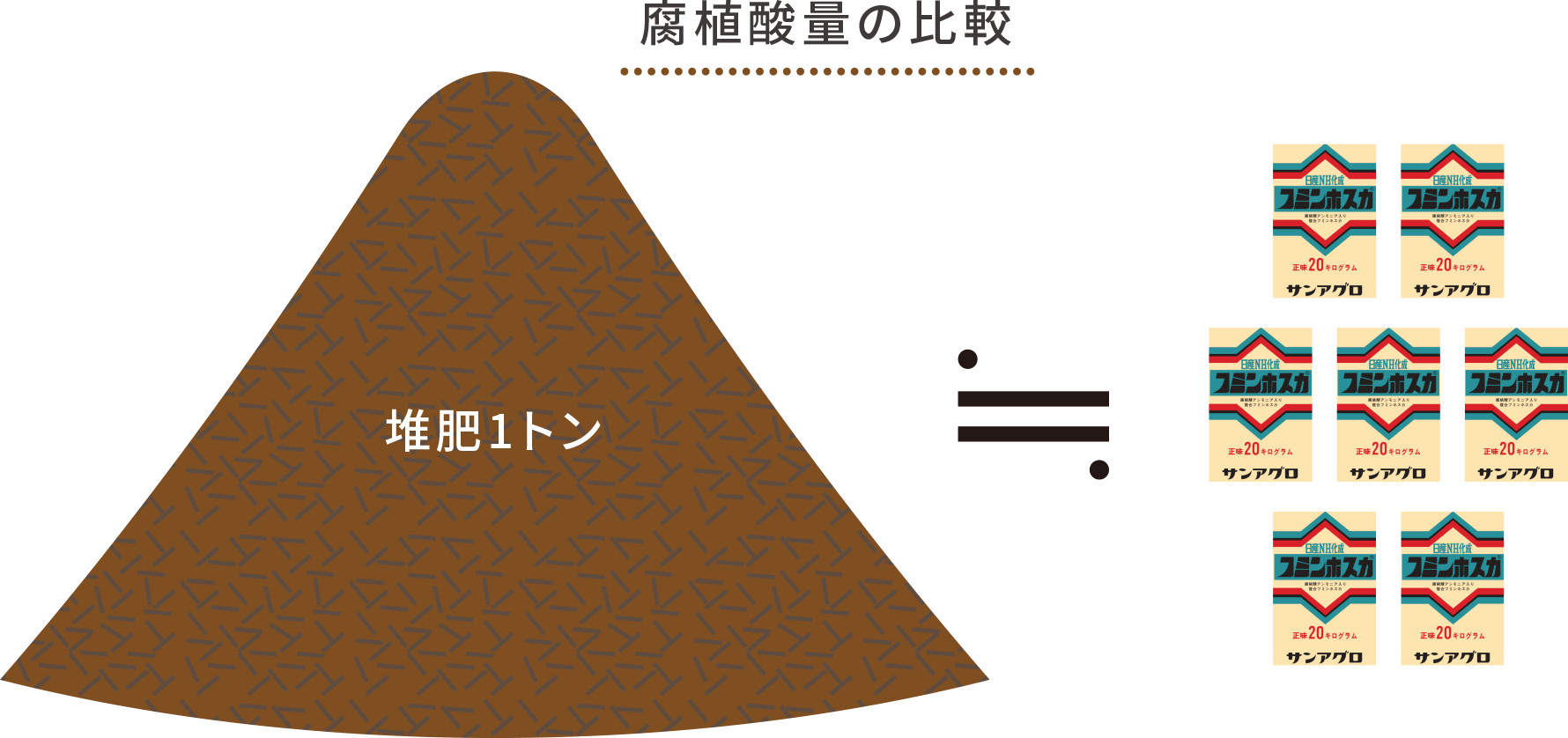 「フミンホスカ」にはニトロフミン酸を豊富に配合してあるため、7〜8袋(140〜160kg分)で堆肥1t分に相当する腐植酸を供給することができます。