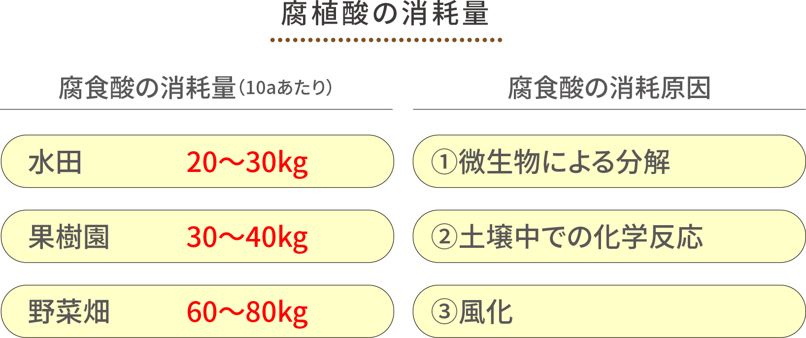 また、腐植酸は、一度入れても、放っておくと、どんどん減っていきます。堆肥でまかなおうとすると、何度も大量に入れる必要がでてきます。