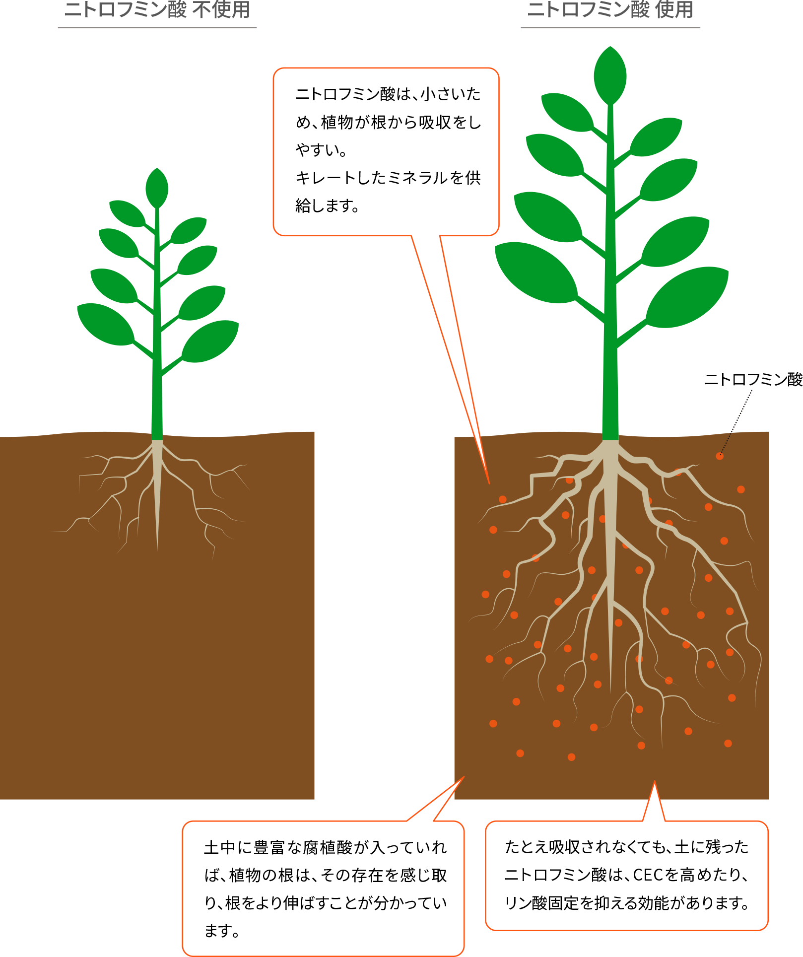 ニトロフミン酸は、土壌の中で、天然のフミン酸(腐植質の一つ)に勝るとも劣らない働きをし、リン酸の肥効の持続効果もあると考えられています。