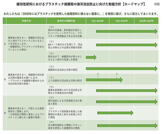 「2030 年には、プラスチックを使用した被覆肥料に頼らない農業に」を理想に掲げ、全国農業組合連合会、全国複合肥料工業会、日本肥料アンモニア協会が2022年に公表した取り組み方針ならびにロードマップ。