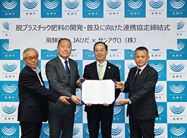 2025年3月、岐阜県飛騨市、JAひだ、サンアグロの3者は「脱プラスチック肥料の開発・普及に向けた連携協定」を締結しました。