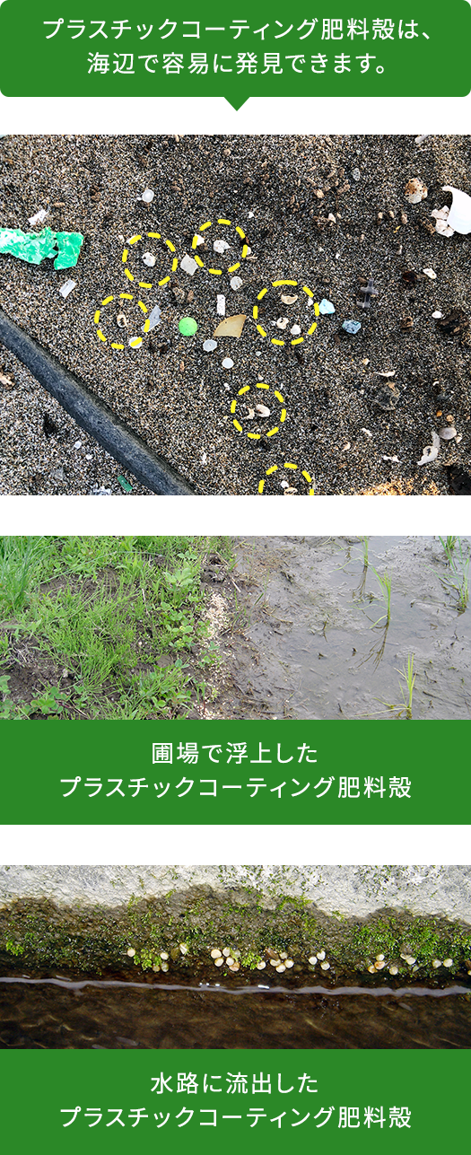 しかし、プラスチックでコーティングされた緩効性肥料では、そのプラスチックの殻が、圃場から流出し、用水路や河川、湖沼、最終的には海洋にまで流れてしまうことが問題視されています。
