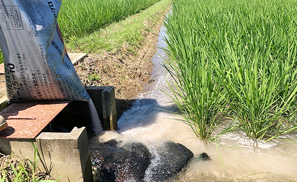 水稲の追肥として、水田の水口から灌がい水と一緒に肥料を流しこむだけの施肥方法です。大幅な省力化、時間短縮を実現するのはもちろん、土壌吸着性に優れた「ポーラス肥料」を使用するため、地下水や河川といった環境への負荷も軽減します。